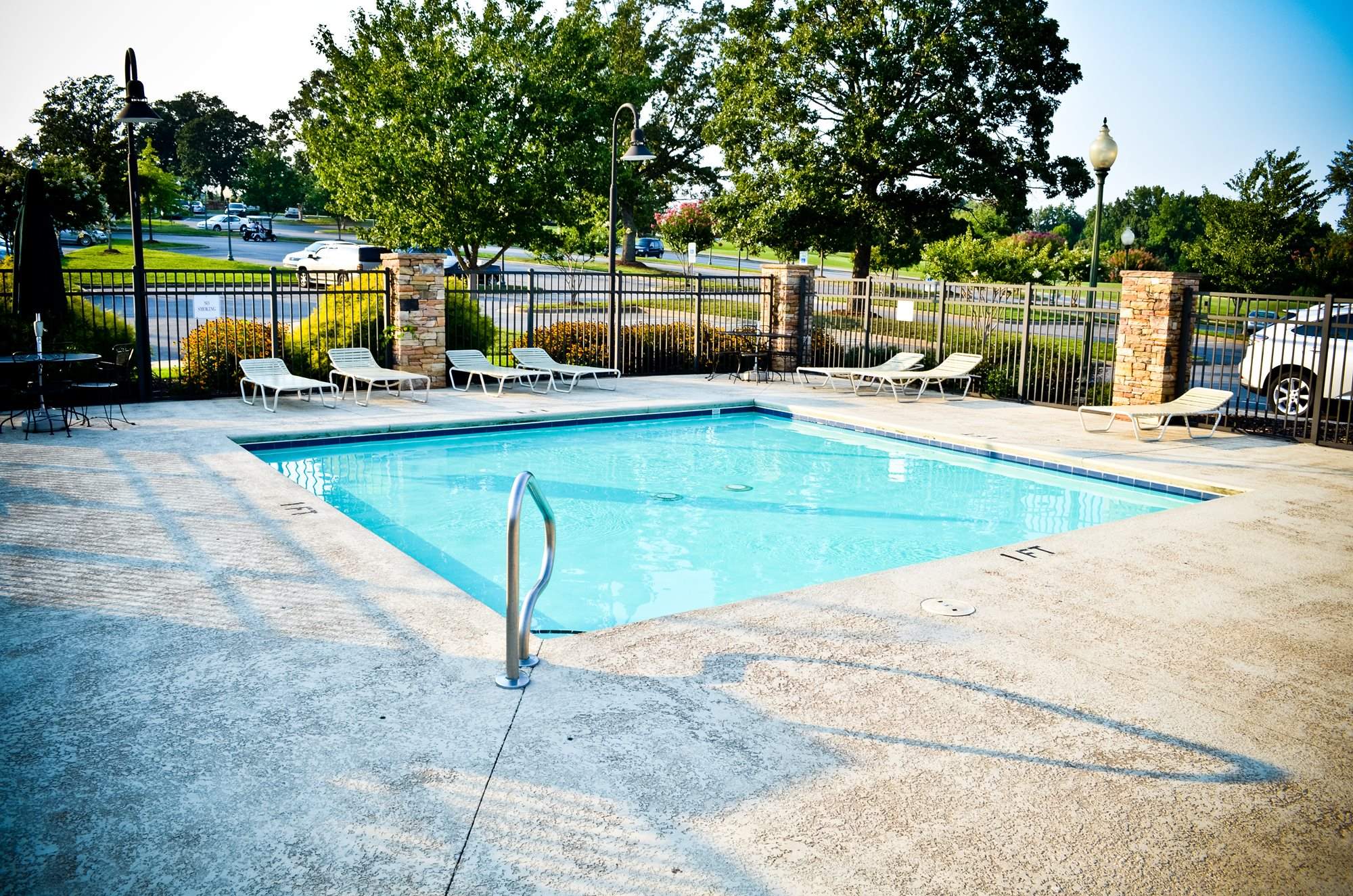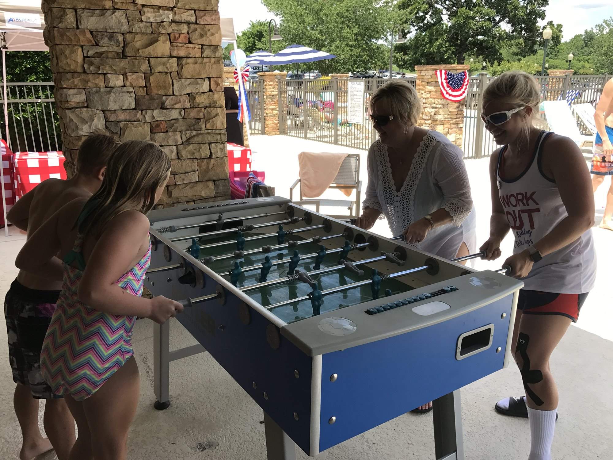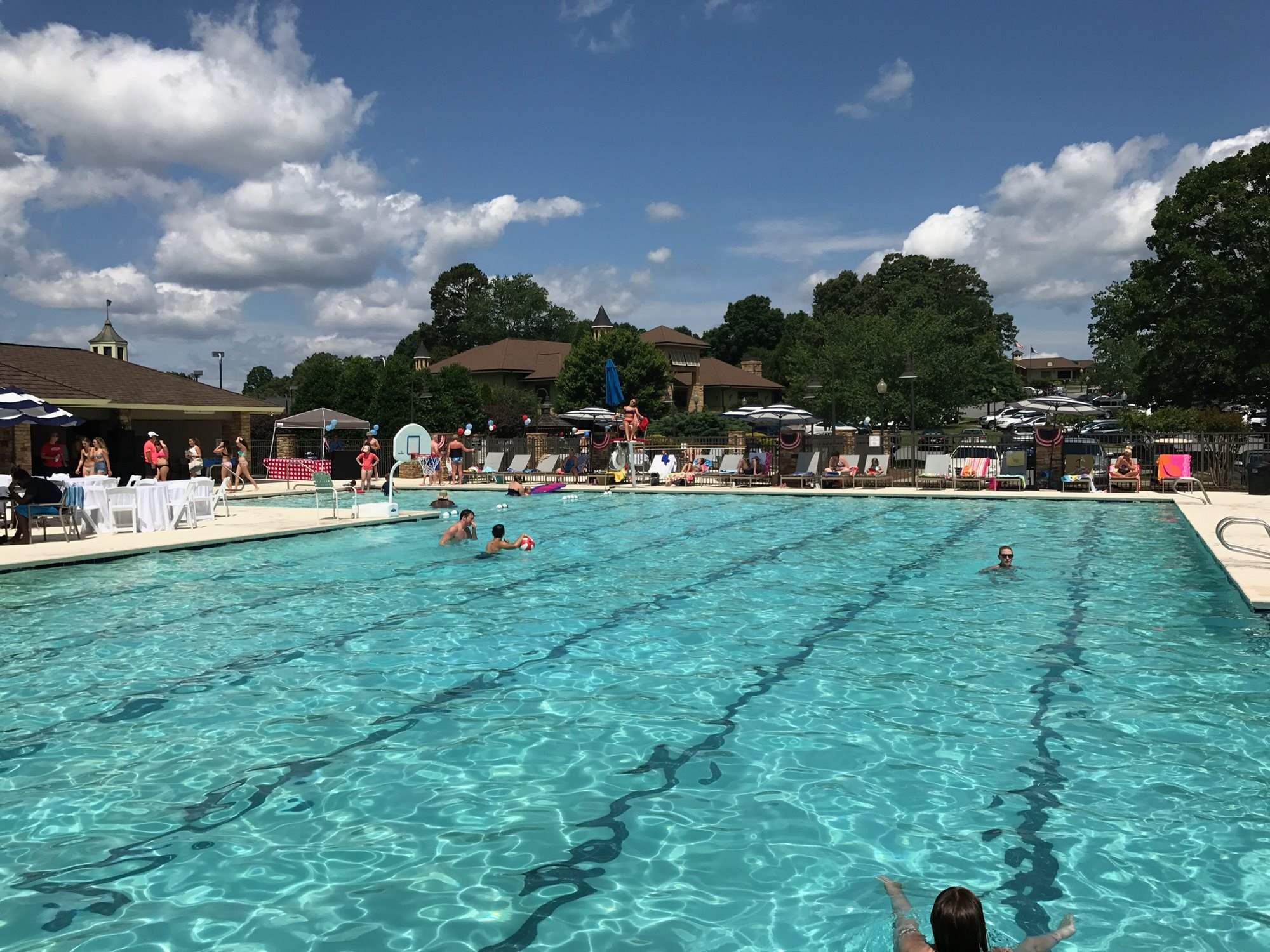 Our Aquatic Center is reserved for members and their guests and includes an Olympic-sized swimming pool, diving board, and a gated toddler pool. Experienced instructors offer seasonal water aerobics classes. The Aquatic Center hosts pool-side events, parties, socials, and evening adult-only swim options throughout the spring and summer seasons. The Aquatic Center provides members with the ultimate oasis with pool-side lounge chairs, vending machines with cool beverages and snacks for all ages. Members may bring small personal coolers to the pool, but we ask that you not bring any items in glass.